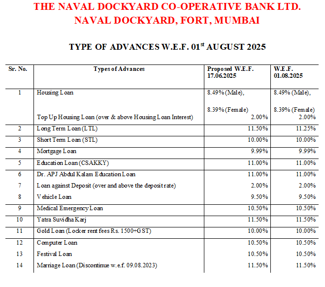 THE NAVAL DOCKYARD COOPERATIVE BANK offers a bouquet of services for Loans and Advances.